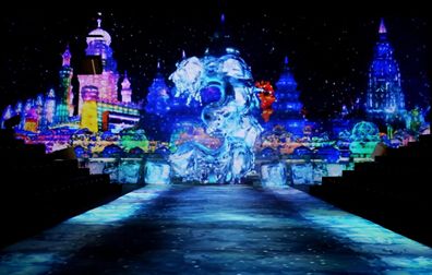 水晶球汇聚照亮舞台,倒计时数字开始渐次呈现。数虎设计师在倒计时画面视觉上注重画中元素的前后关系,让数字展示更具纵深感。除了视觉特效,每一个数字的呈现都伴随着一幅或凸显哈尔滨地域特色、或凸显时装周时尚元素的影像画面。当一片冰雪世界从背景向地面迅速铺开,把观众带进了童话般的场景,极显冰城特色。